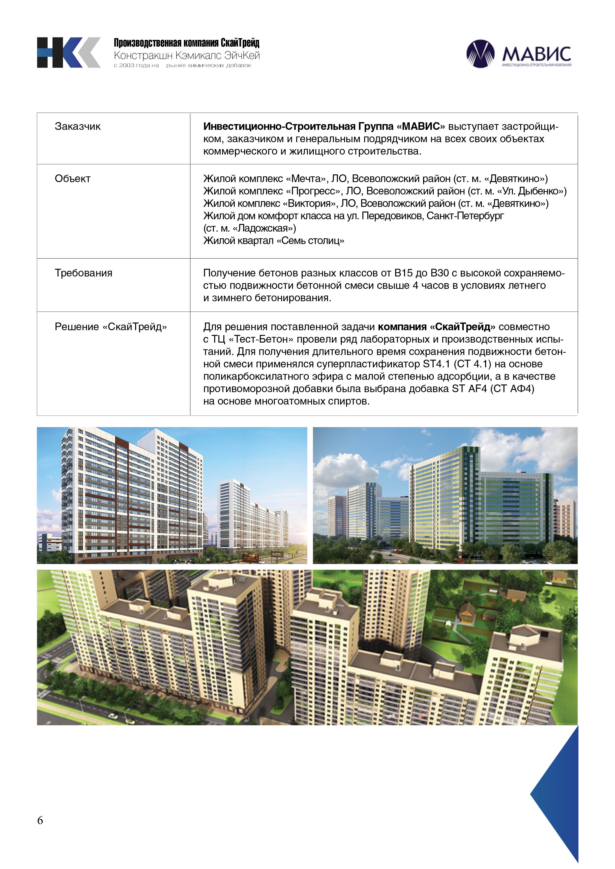 Для решения поставленной задачи компания «СкайТрейд» совместно с ТЦ «Тест-Бетон» провели ряд лабораторных и производственных испытаний. Для получения длительного время сохранения подвижности бетонной смеси применялся суперпластификатор ST4.1 (СТ4.1) на основе поликарбоксилатного эфира с малой степенью адсорбции, а в качестве противоморозной добавки была выбрана добавка ST AF4 (СТ АФ4) на основе многоатомных спиртов.