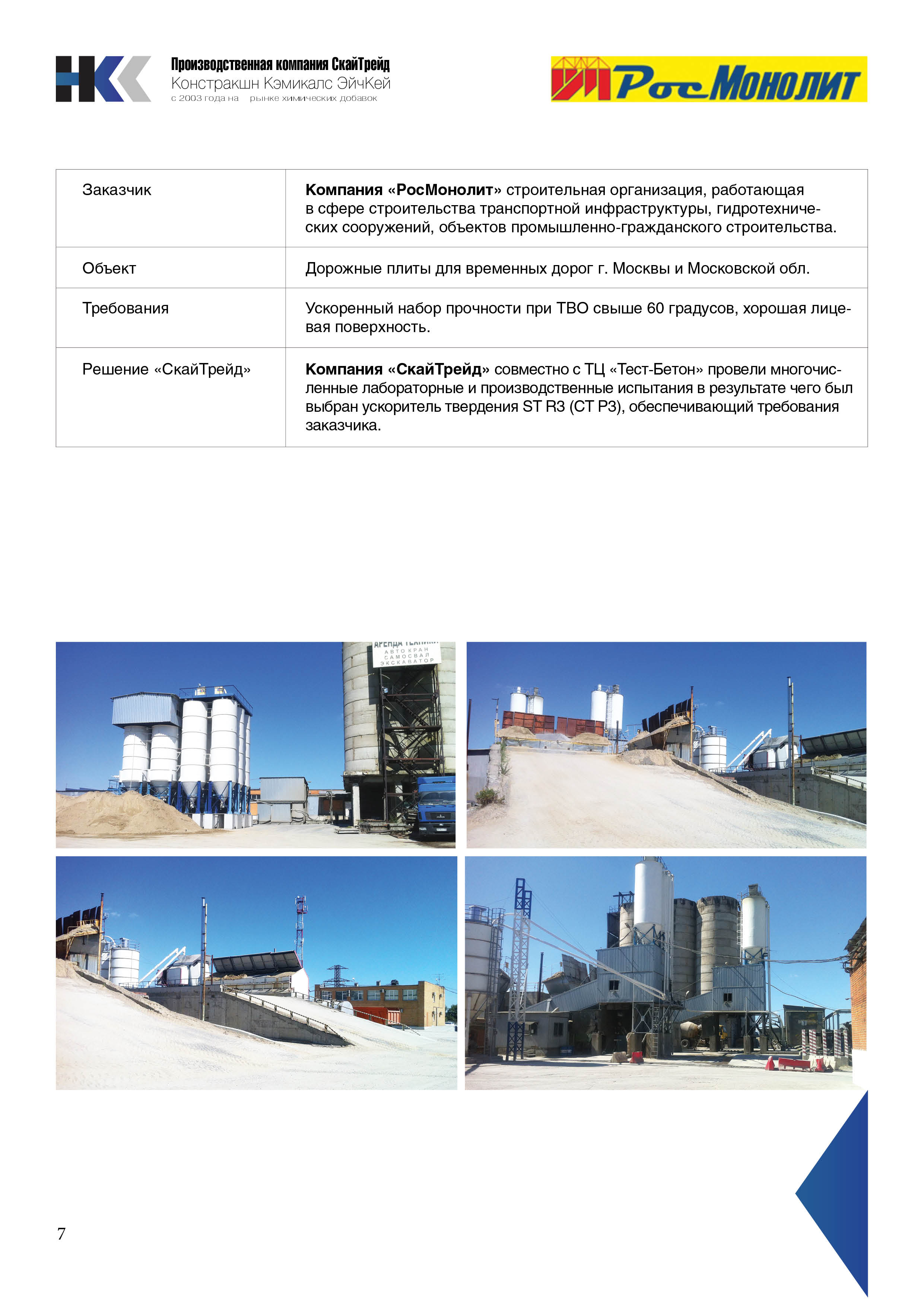 Компания «СкайТрейд» совместно с ТЦ «Тест-Бетон» провели многочисленные лабораторные и производственные испытания в результате чего был выбран ускоритель твердения ST R3 (СТ Р3), обеспечивающий требования заказчика.