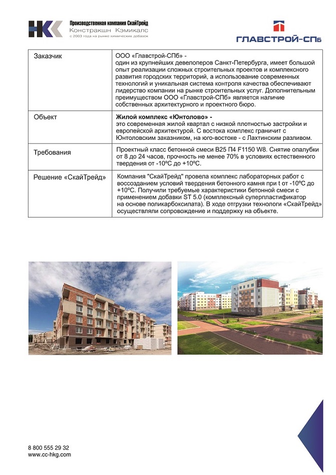 Компания "СкайТрейд" провела комплекс лабораторных работ с воссозданием условий твердения бетонного камня при t от -10ºС до +10ºС. Получили требуемые характеристики бетонной смеси с применением добавки ST 5.0 (комплексный суперпластификатор на основе поликарбоксилата). В ходе отгрузки технологи «СкайТрейд» осуществляли сопровождение и поддержку на объекте.