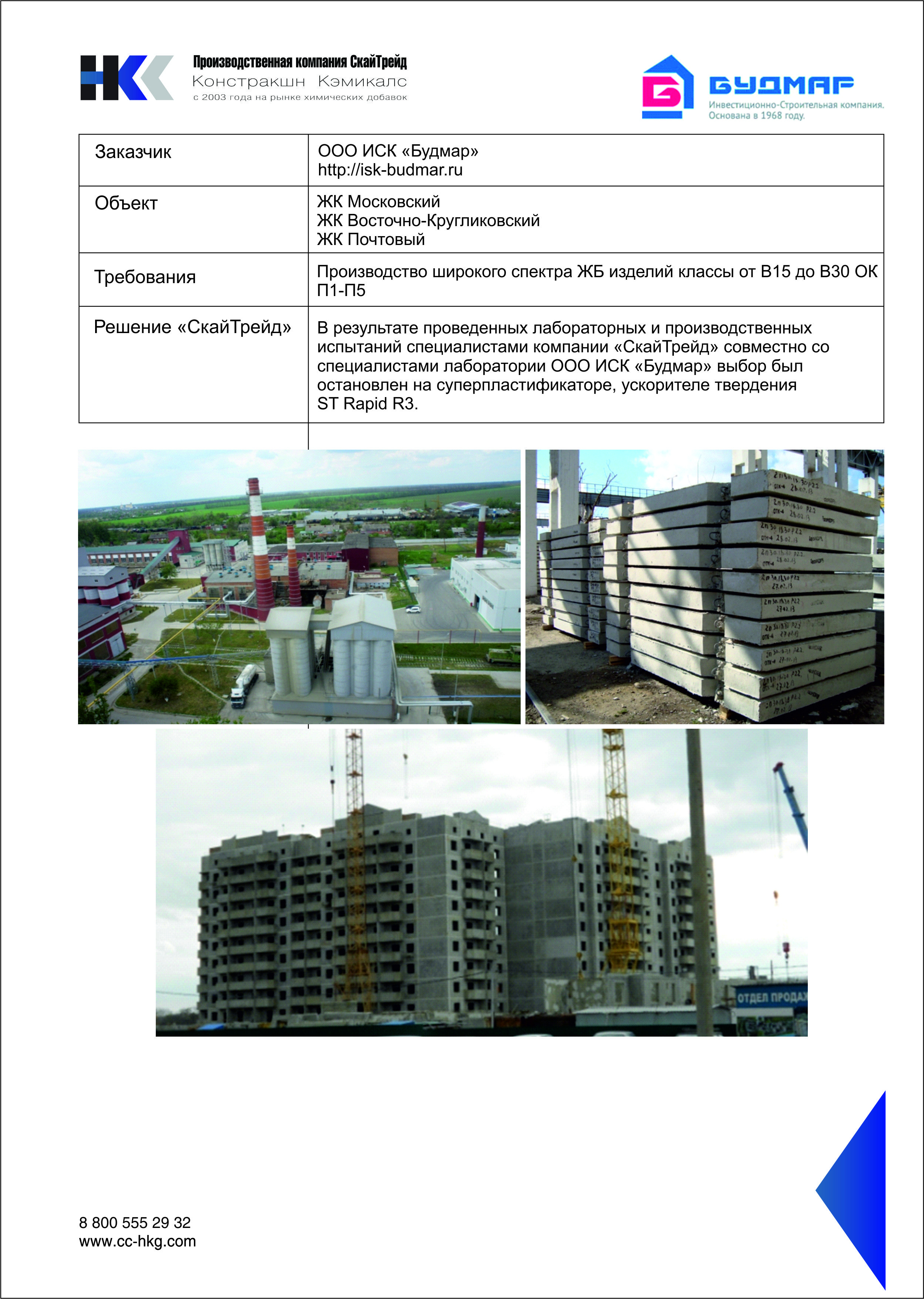 В результате проведенных лабораторных и производственных испытаний специалистами компании «СкайТрейд» совместно со специалистами лаборатории ООО ИСК «Будмар» выбор был остановлен на суперпластификаторе, ускорителе твердения ST Rapid R3.