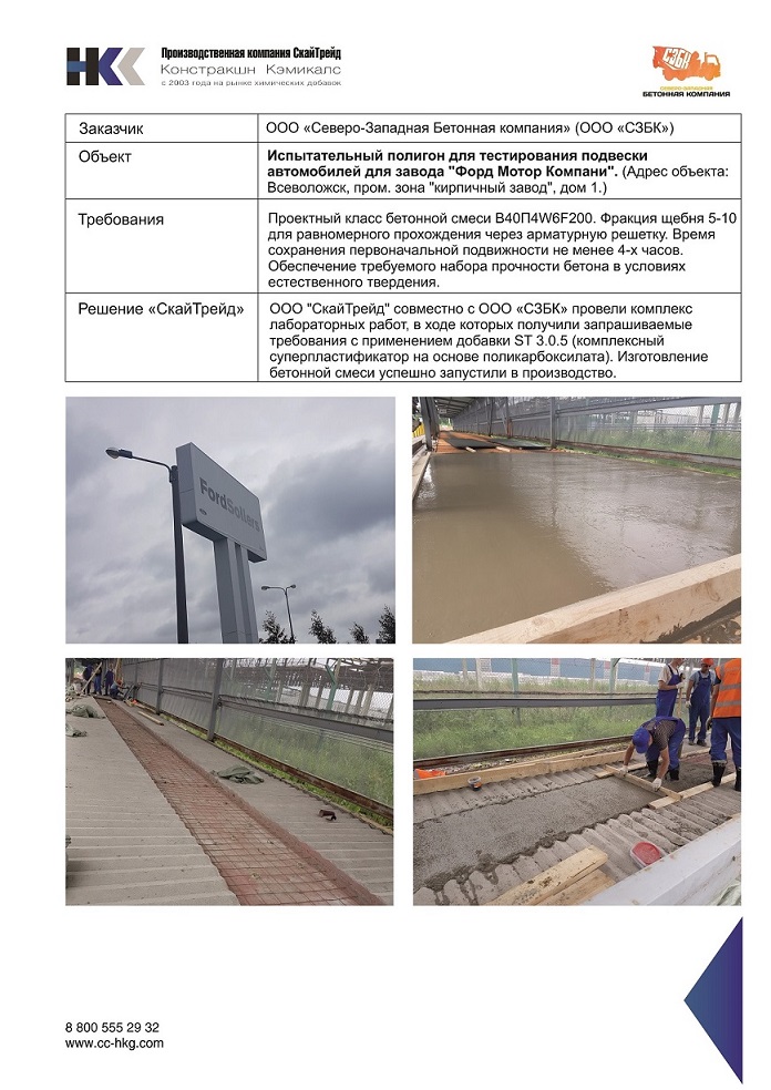 ООО "СкайТрейд" совместно с ООО «СЗБК» провели комплекс лабораторных работ, в ходе которых получили запрашиваемые требования с применением добавки ST 3.0.5 (комплексный суперпластификатор на основе поликарбоксилата). Изготовление бетонной смеси успешно запустили в производство.