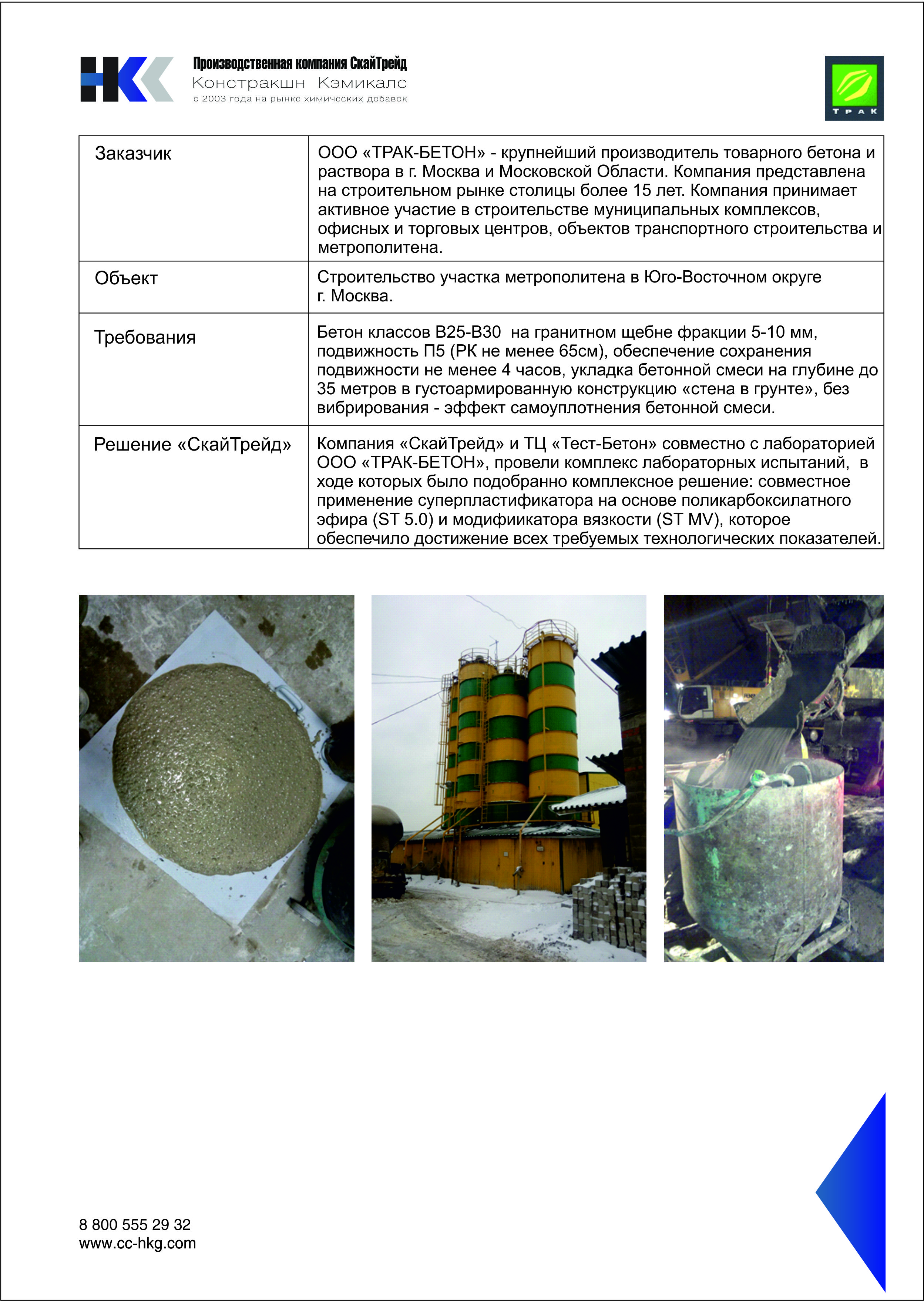 Бетон классов В25-В30 на гранитном щебне фракции 5-10 мм, подвижность П5 (РК не менее 65см), обеспечение сохранения подвижности не менее 4 часов, укладка бетонной смеси на глубине до 35 метров в густоармированную конструкцию «стена в грунте», без вибрирования - эффект самоуплотнения бетонной смеси.