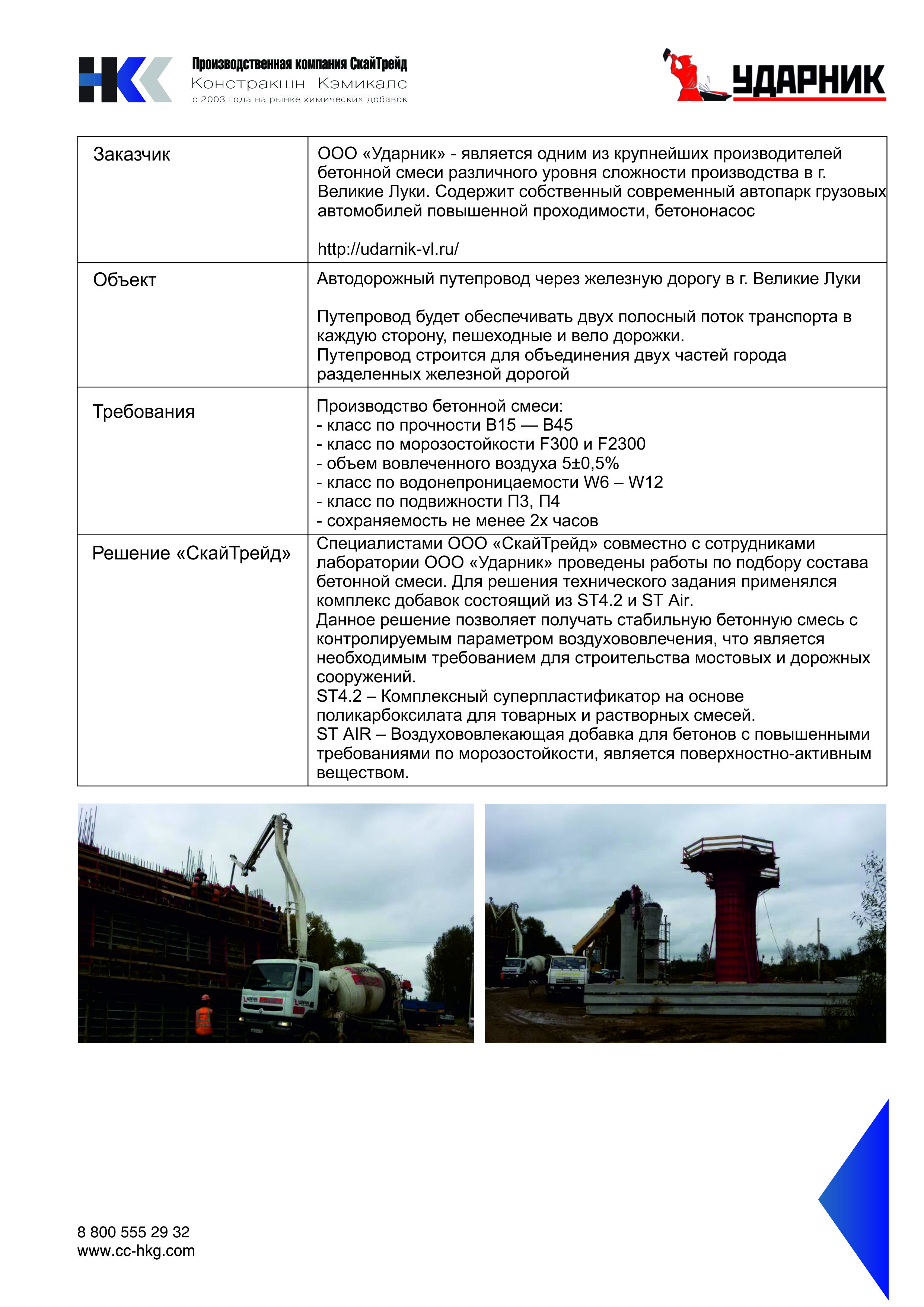 Специалистами ООО «СкайТрейд» совместно с сотрудниками лаборатории ООО «Ударник» проведены работы по подбору состава бетонной смеси. Для решения технического задания применялся комплекс добавок состоящий из ST4.2 и ST Air.