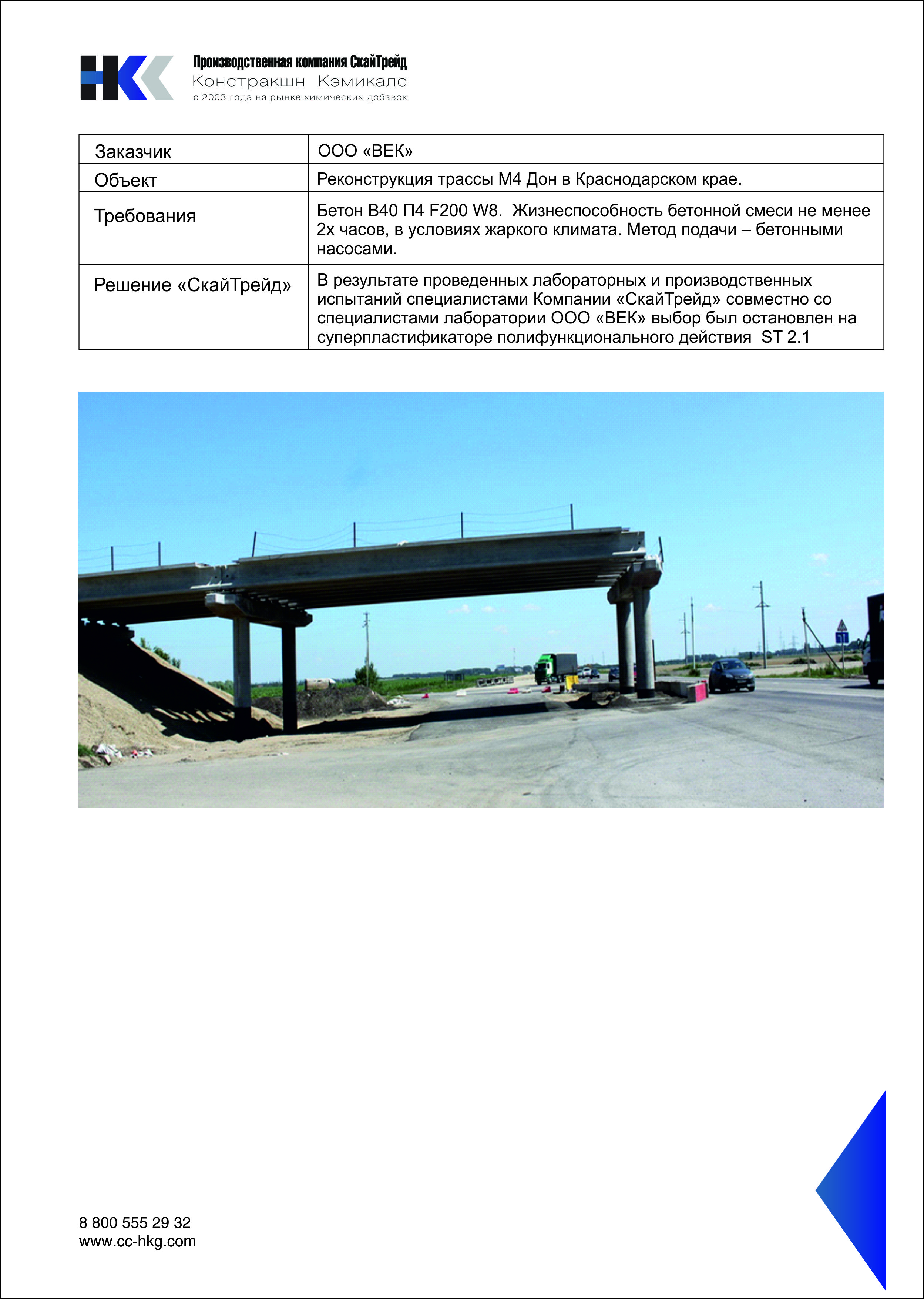 В результате проведенных лабораторных и производственных испытаний специалистами Компании «СкайТрейд» совместно со специалистами лаборатории ООО «ВЕК» выбор был остановлен на суперпластификаторе полифункционального действия ST 2.1