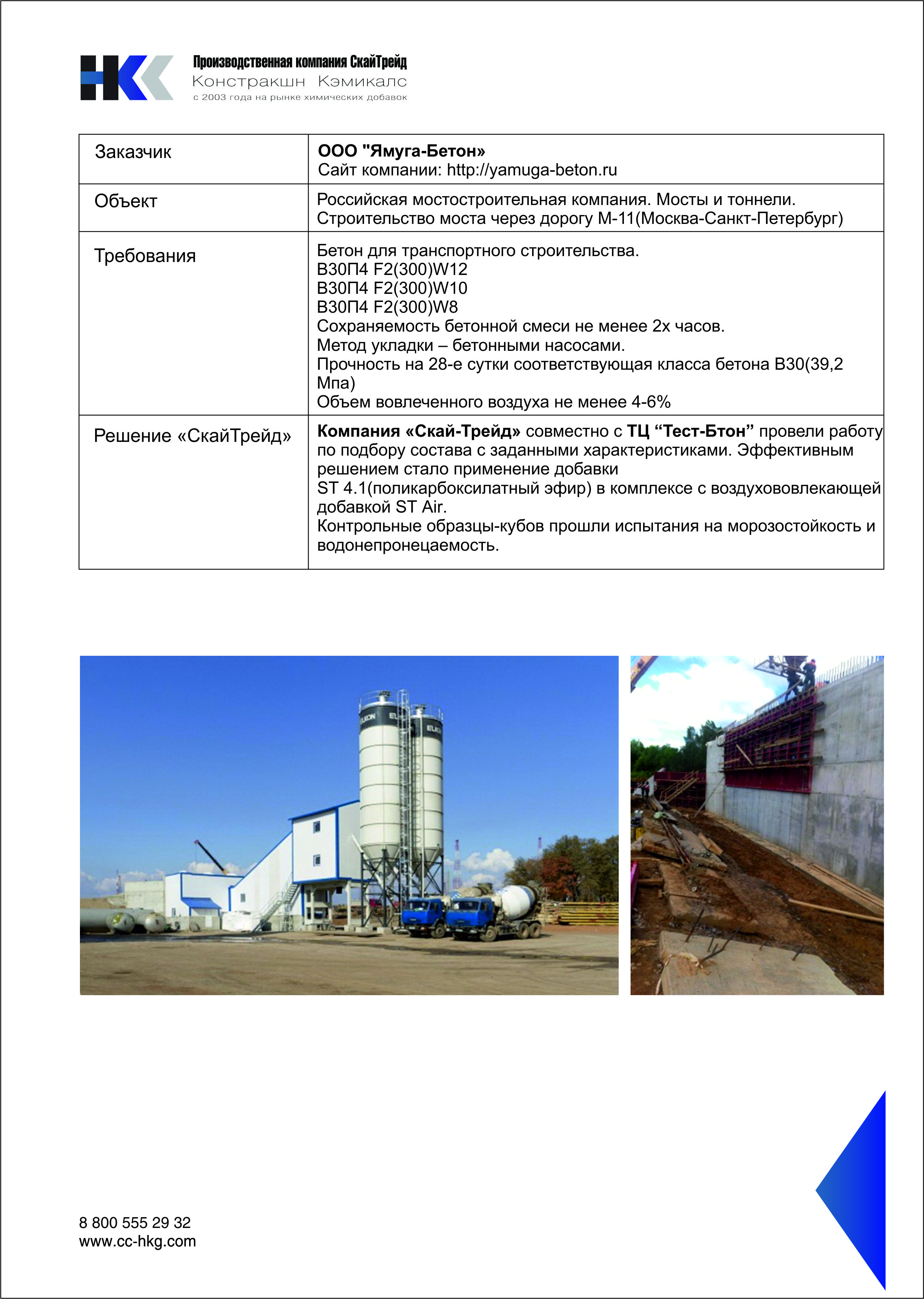 Компания «Скай-Трейд» совместно с ТЦ “Тест-Бтон” провели работу по подбору состава с заданными характеристиками. Контрольные образцы-кубов прошли испытания на морозостойкость и водонепронецаемость. Эффективным решением стало применение добавки ST 4.1(поликарбоксилатный эфир) в комплексе с воздухововлекающей добавкой ST Air.