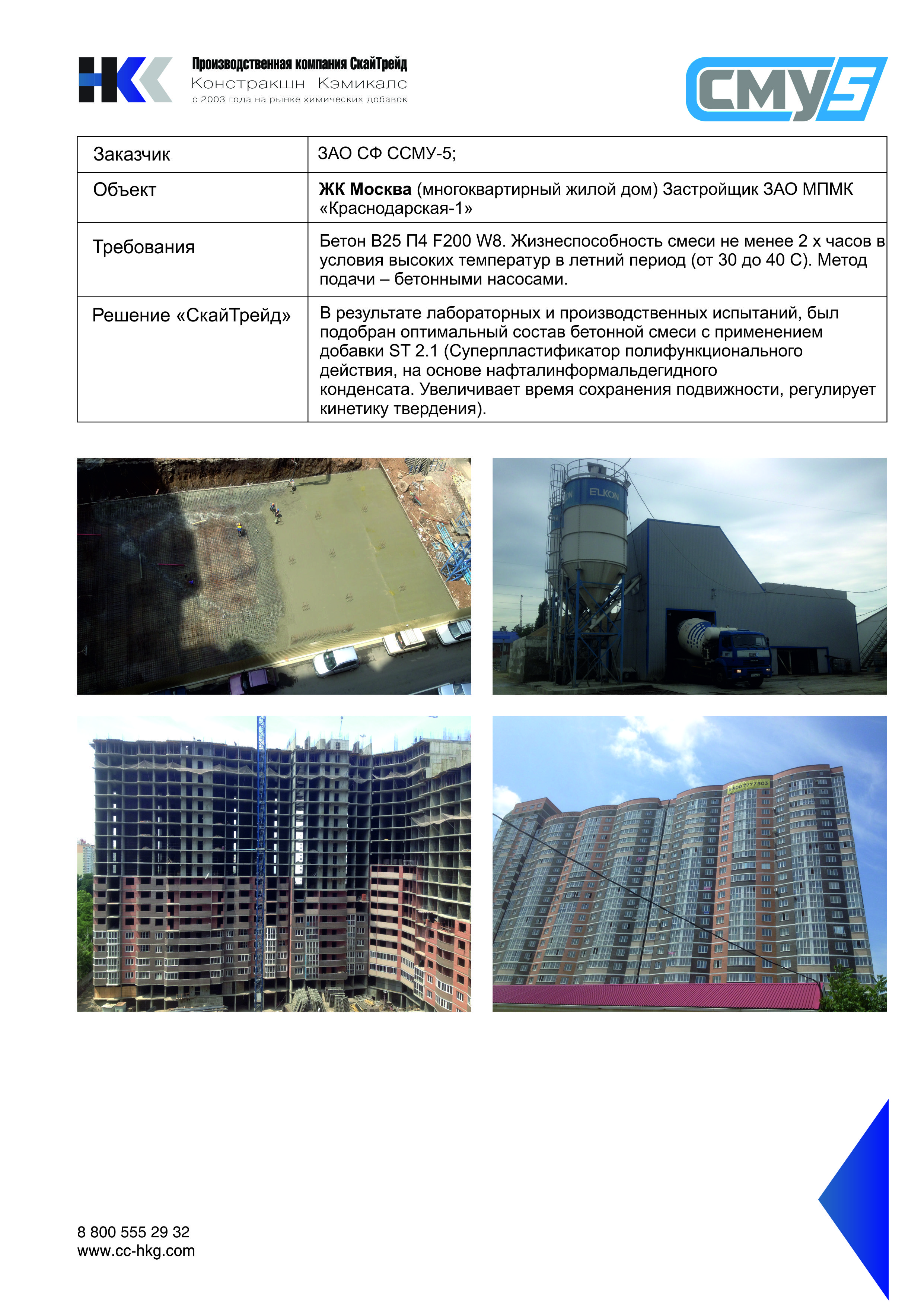 В результате лабораторных и производственных испытаний, был подобран оптимальный состав бетонной смеси с применением добавки ST 2.1 (Суперпластификатор полифункционального действия, на основе нафталинформальдегидного конденсата. Увеличивает время сохранения подвижности, регулирует кинетику твердения).